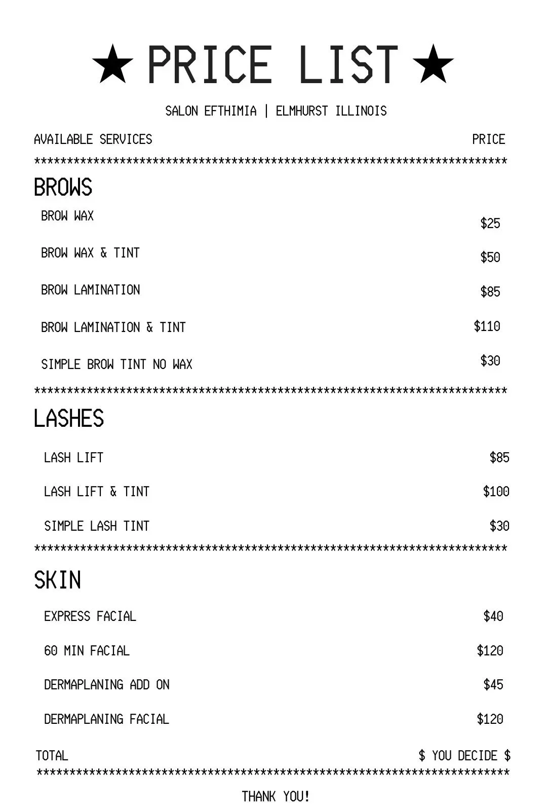 all esthetic services are all available at Salon Efthimia in Elmhurst, illinois ONLY!